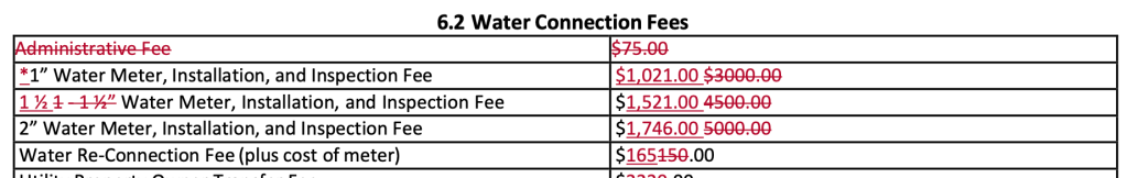 The new rates reflect a 66% decrease from 2022, but is still about 50% higher than the original $985 previously charged for a 1 1/2″ meter. The Town did not provide data nor analysis to support the new fees.