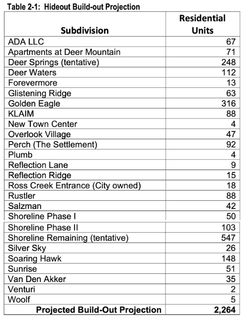 Hideout’s 2020 Capital Improvement Plan includes a s list of all subdivision and their future buildout, setting future full buildout at 2,264 units: